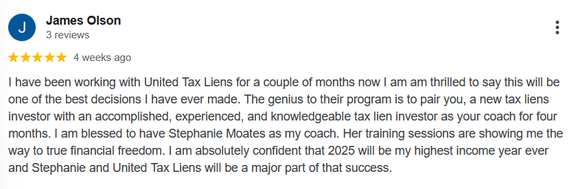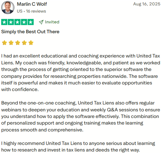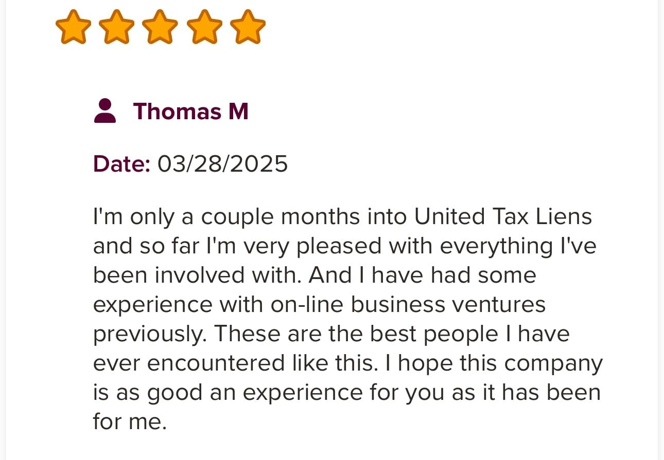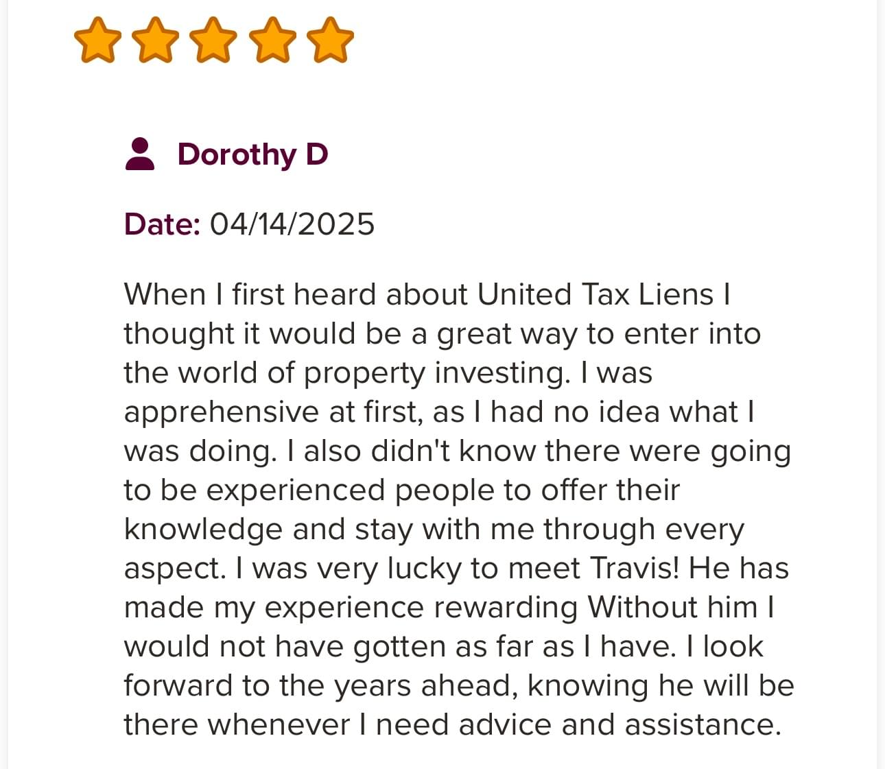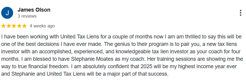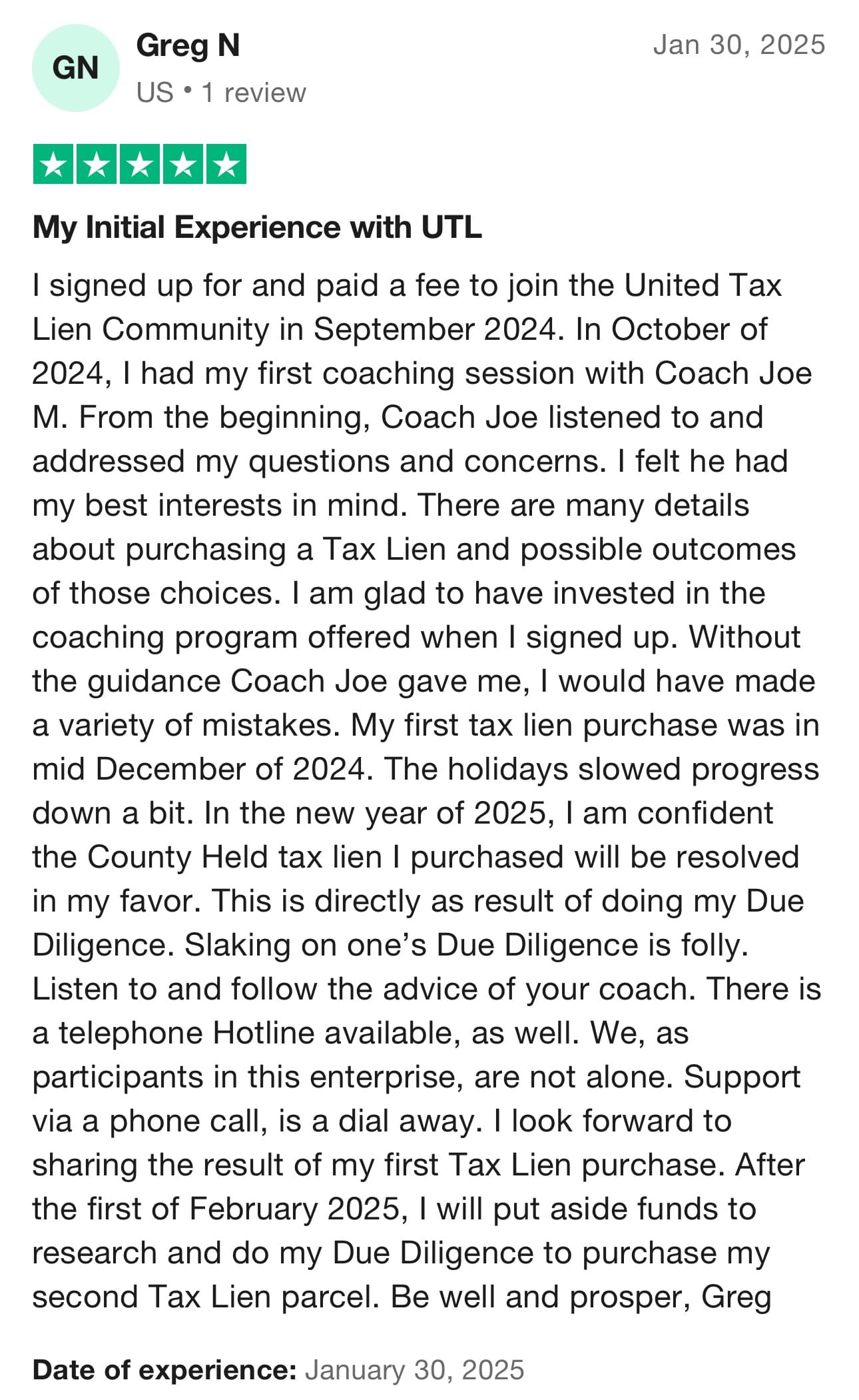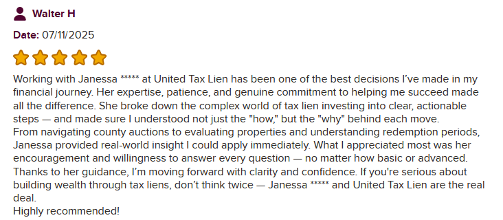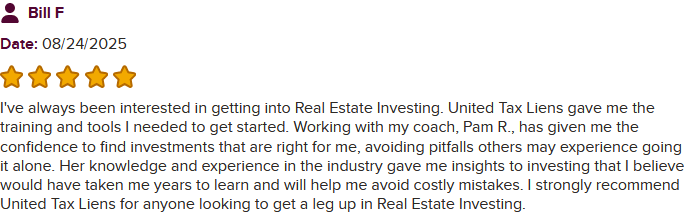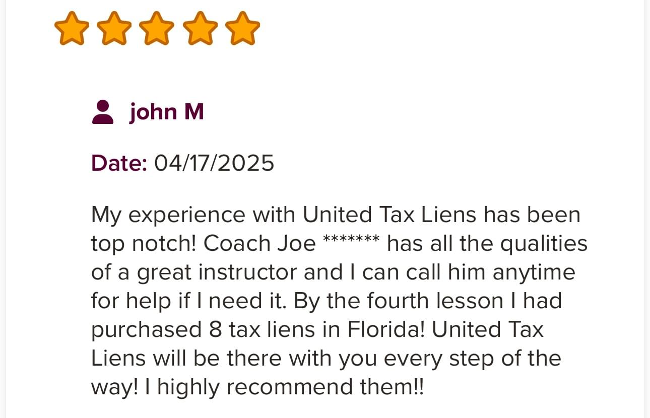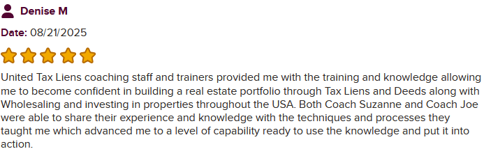 United Tax Liens is a direct-to-consumer real estate education and training company. We do not sell a business opportunity, “get rich quick” program or money-making system. We believe, with education, individuals can be better prepared to make investment decisions, but we do not guarantee success in investing. We do not make earnings claims, efforts claims, return on investment claims, or claims that our training will make you any money. Statements and depictions are the opinions, findings, or experiences of individuals who generally have purchased education and training. Results vary, are not typical, and rely on individual effort, time, and skill, as well as market conditions and other factors. We do not measure earnings or financial performance. Instead, we track completed transactions and satisfaction of services by voluntary surveys. Results show that most Advanced Training customers who apply the training and make offers ultimately complete transactions. You should not, however, equate completed transactions with financially successful transactions. Further, many customers do not continue with the program, do not apply what they learn, or do attempt to apply what they learn but nonetheless have difficulty in making real estate successful for them. You should assume that most customers do not complete transactions. The Company may link to content or refer to content and/or services created by or provided by third parties that are not affiliated with the Company. The Company is not responsible for such content and does not endorse or approve it. The Company may provide services by or refer you to third-party businesses. Some of these businesses have common interest and ownership with the Company. Third-party company names, logos, and products are trademarks or registered trademarks of their respective holders. I understand that by submitting this application, I am also authorizing United Tax Liens and its partners to obtain my personal credit profile through a soft inquiry under the FCRA solely to conduct a credit pre-qualification.