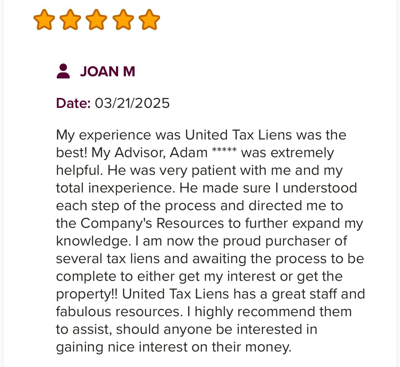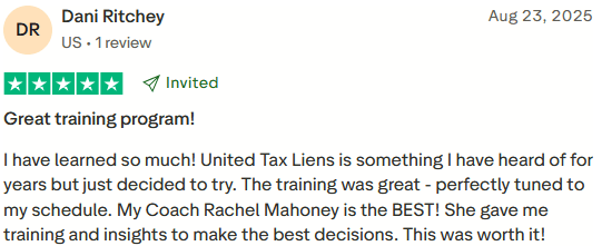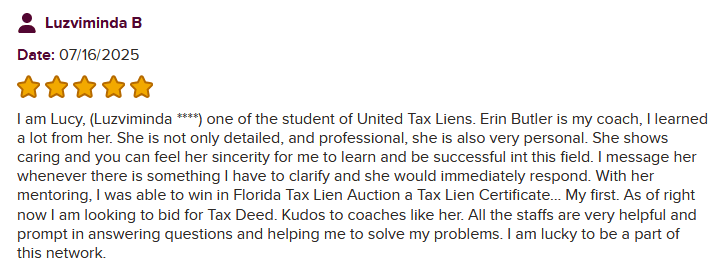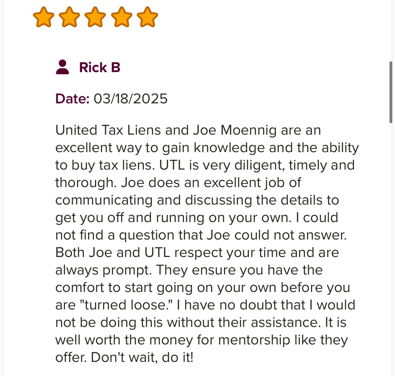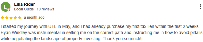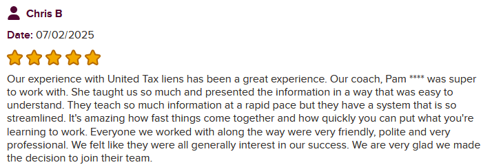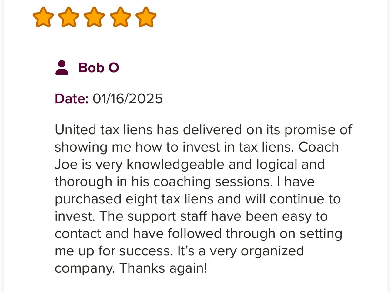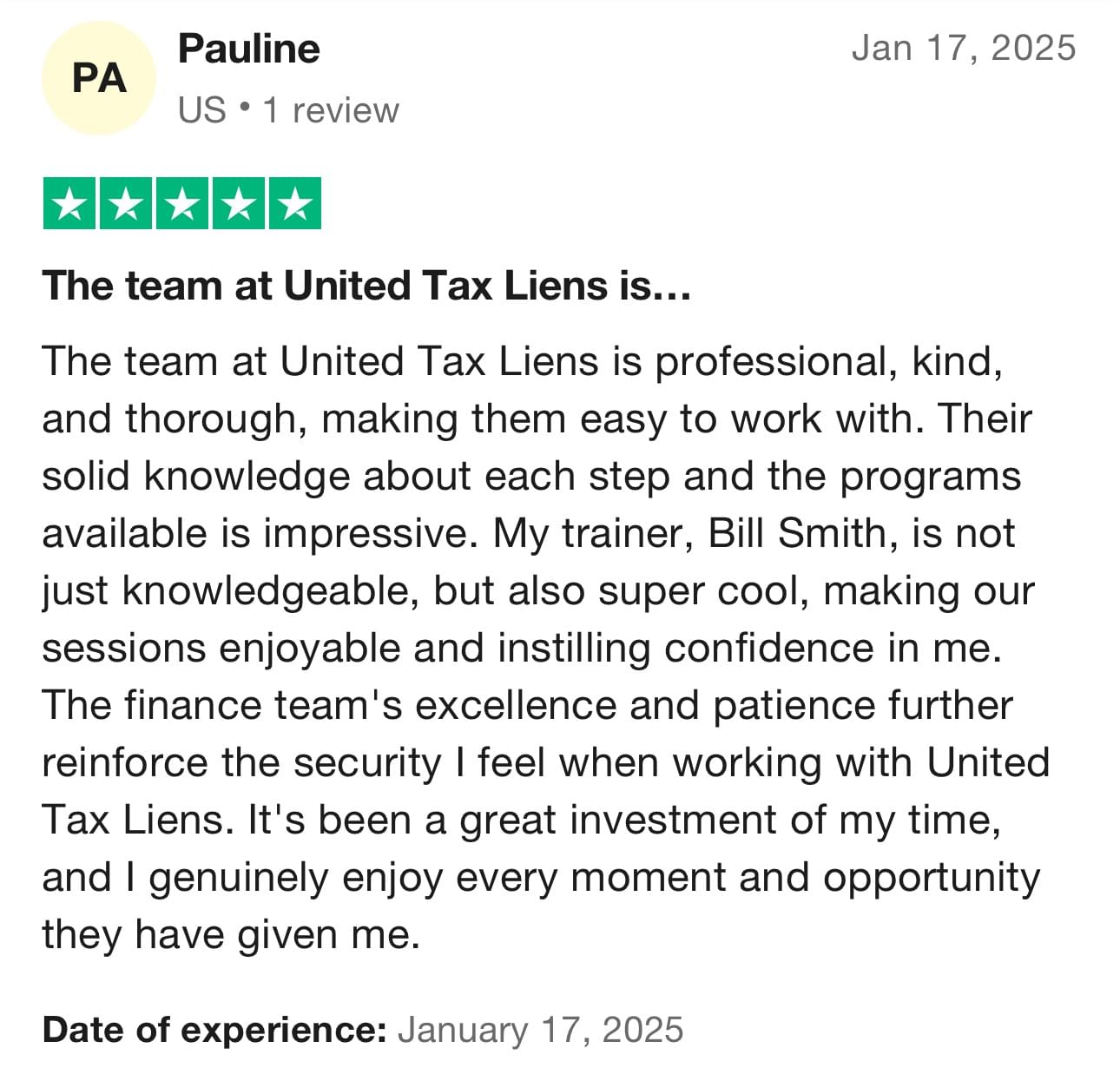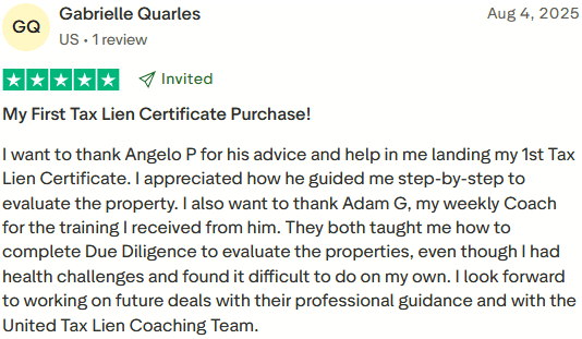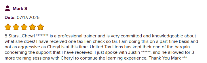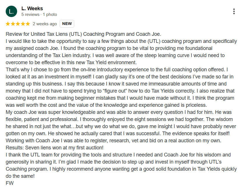 United Tax Liens is a direct-to-consumer real estate education and training company. We do not sell a business opportunity, “get rich quick” program or money-making system. We believe, with education, individuals can be better prepared to make investment decisions, but we do not guarantee success in investing. We do not make earnings claims, efforts claims, return on investment claims, or claims that our training will make you any money. Statements and depictions are the opinions, findings, or experiences of individuals who generally have purchased education and training. Results vary, are not typical, and rely on individual effort, time, and skill, as well as market conditions and other factors. We do not measure earnings or financial performance. Instead, we track completed transactions and satisfaction of services by voluntary surveys. Results show that most Advanced Training customers who apply the training and make offers ultimately complete transactions. You should not, however, equate completed transactions with financially successful transactions. Further, many customers do not continue with the program, do not apply what they learn, or do attempt to apply what they learn but nonetheless have difficulty in making real estate successful for them. You should assume that most customers do not complete transactions. The Company may link to content or refer to content and/or services created by or provided by third parties that are not affiliated with the Company. The Company is not responsible for such content and does not endorse or approve it. The Company may provide services by or refer you to third-party businesses. Some of these businesses have common interest and ownership with the Company. Third-party company names, logos, and products are trademarks or registered trademarks of their respective holders. I understand that by submitting this application, I am also authorizing United Tax Liens and its partners to obtain my personal credit profile through a soft inquiry under the FCRA solely to conduct a credit pre-qualification.